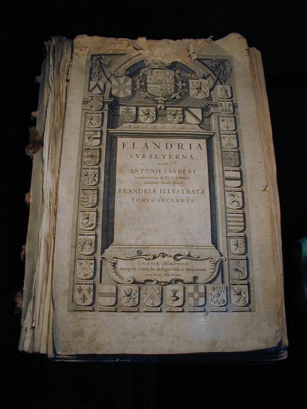 «Фландрыя скораная, або Антуана Сандэрcа [...] “Фландрыі ў ілюстрацыях” том другі» – гістарыяграфічная і тапаграфічная праца 1644 г. фламандскага гісторыка і паэта, дзеяча каталіцкай царквы Антуана Сандэрса (1586–1664). На тытульным лісце наўмысна пададзены недакладныя выхадныя звесткі, згодна з якімі месцам выдання пазначаны Кёльн. Кніга насамрэч была надрукавана ў Амстэрдаме Янам і Карнэліусам Блау. Праца змяшчае гістарычныя апісанні асноўных гарадоў і вёсак былога графства Фландрыя, распавядае пра жыццё яго графаў і біскупаў. Выданне багата ілюстраванае: 153 гравюры на медзі (планы гарадоў, выявы цэркваў і манастыроў, ваенных умацаванняў, прыватных дамоў, партрэты гістарычных асоб і геральдычныя выявы), ініцыялы (131 адбітак з 87-і дошак); канцоўкі (4 адбіткі з 3-х дошак). Папера ручнога адліву без вадзяных знакаў. Памеры кнігі ўражваюць: 51х35х6 (у развароце – 68) см. У фонды музея-запаведніка выданне паступіла з абменна-рэзервовага фонду Дзяржаўнай публічнай бібліятэкі імя М.Я. Салтыкова-Шчадрына (сёння – Расійская нацыянальная бібліятэка, СПб). Гэтая праца некалькі разоў перавыдавалася і перакладалася да XVIII ст.